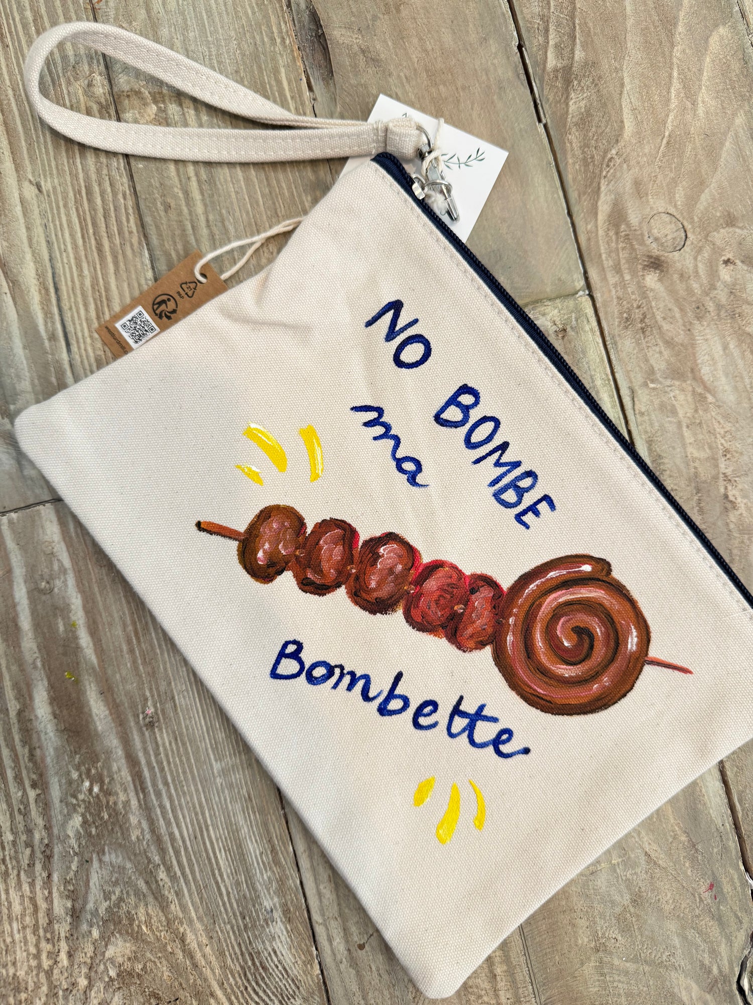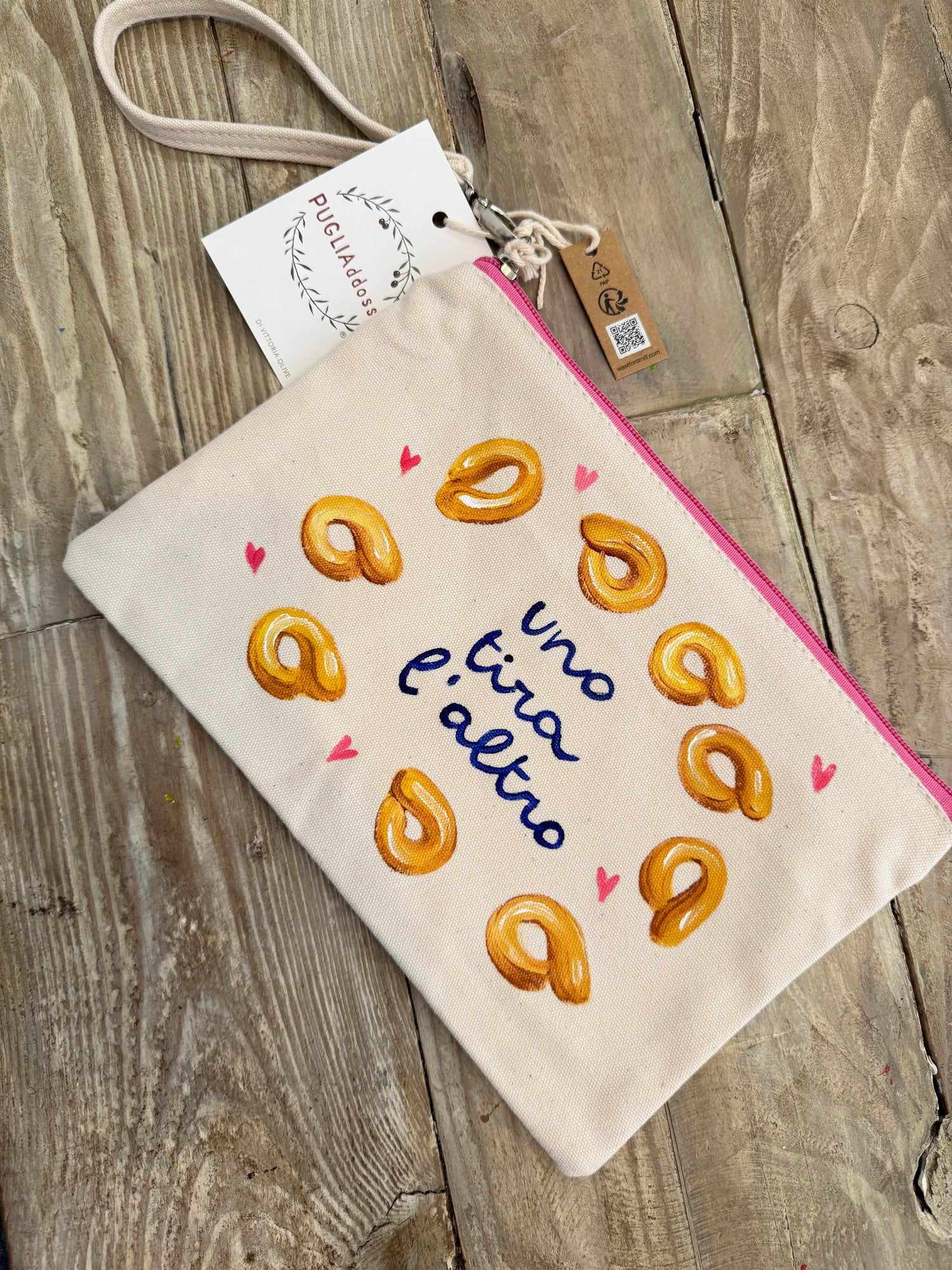 Pochette in cotone organico dipinta a mano con soggetti tipici pugliesi. È dotata di un braccialetto removibile in stoffa per poterla indossare al polso comodamente.