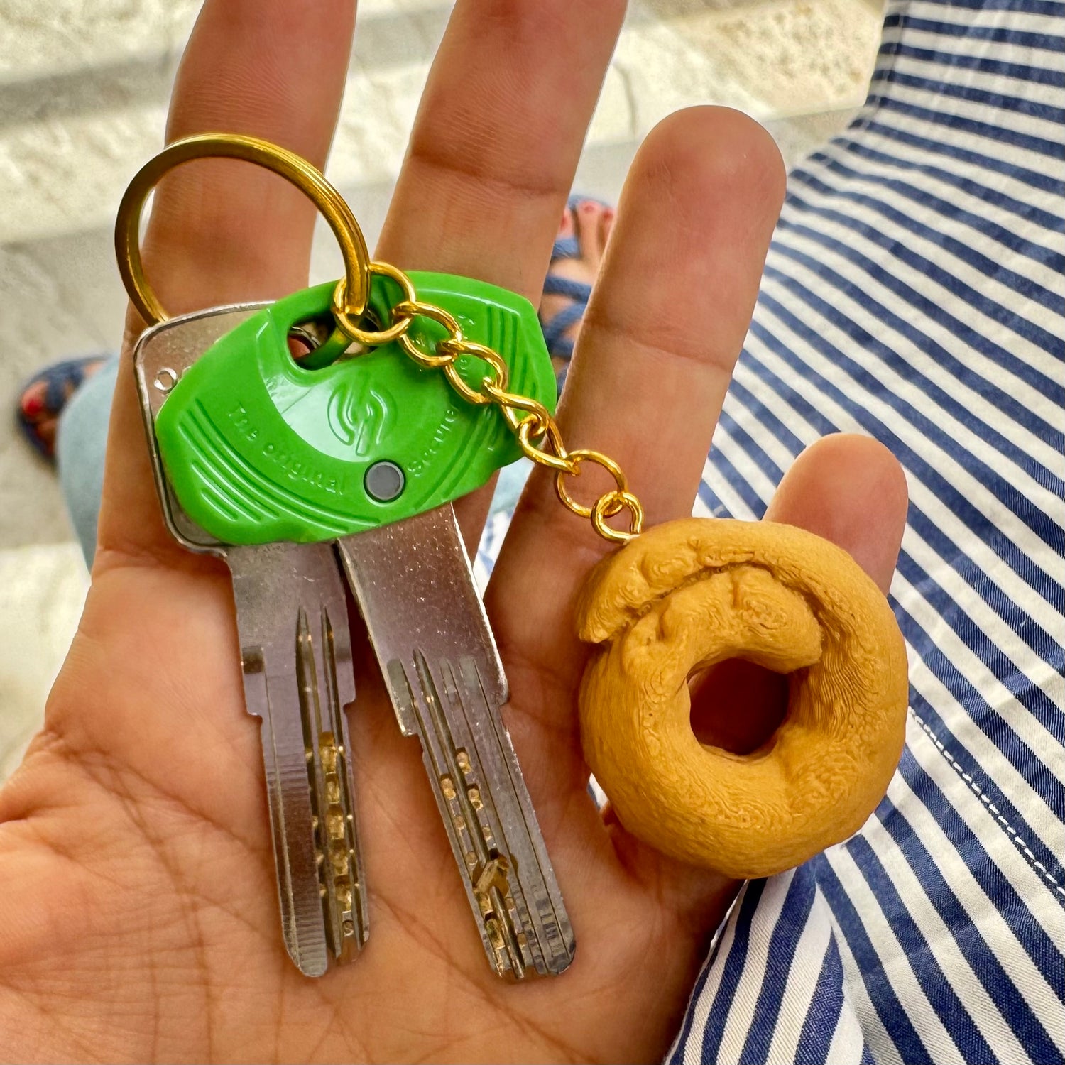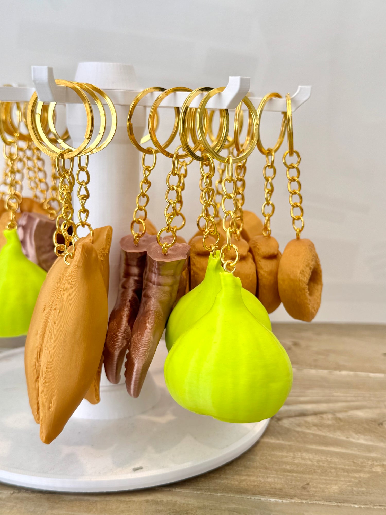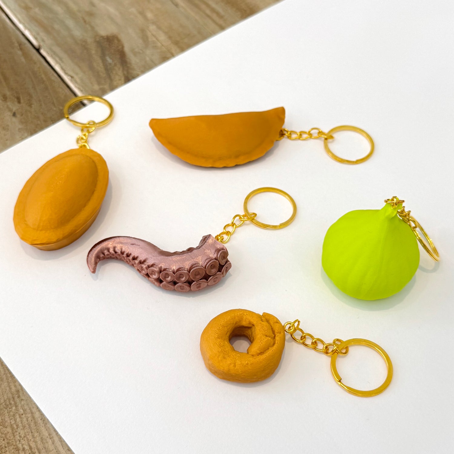 Portachiavi a forma di simboli pugliesi realizzati con la tecnica di stampa 3D in materiali rinnovabili e naturali.
